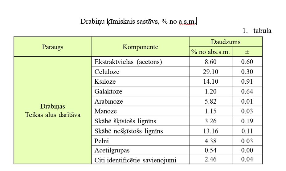 Rezultātā ir noteikts ķīmiskais sastāvs drabiņām, kas ir kā atlikums no alus iegūšanas procesa. Drabiņas piegādāja projekta sadarbības partneris SIA Baltic Oak no savas alus darītavas. Iegūtie rezultāti norāda, ka drabiņas sastāv no celuloze - 29,10%, ksilozes – 14,10%, arabinozes – 5,82%, lignīna - 13,16%, pelniem - 4,38% un citiem savienojumiem, kas ir redzami 1. tabulā. Furfurols veidojas no ksilozes un no arabinozes, tad teorētiskais furfurola iznākums ir 11,76% no a.s.m. Drabiņu ķīmiskais sastāvs norāda, ka šo izejvielu var izmantot kā izejmateriālu furfurola, pienskābes un lignīna ražošanai. Viena no galvenajām un mazāk izpētītām procesa stadijām, augstāk uzrādīto vielu iegūšanai no augu valsts biomasas, ir priekšapstrādes process. Tas ir nepieciešams, lai izmainītu biomasas šūnapvalka mehānisko un ķīmisko struktūru un padarītu to vieglāk pārstrādājamu ogļhidrātu monomēros. Šādu efektu var iegūt ar katalītiskās hidrolīzes paņēmienu, ko mēs varam veikt uz mūsu unikālas eksperimentālās stenda pilotiekārtas. Ar šo metodi, saglabājot celulozi un lignīnu, no biomasas var atšķelt un dehidratēt hemiceluložu pentozes furfurolā, kas ir perspektīva izejviela ķīmiskajā rūpniecībā. Eksperimentālais lignocelulozes paraugs iegūts no drabiņām, apstrādājot tās uz šīs pilotiekārtas. Nepieciešamos priekšapstrādes procesa parametrus izvēlējāmies ņemot vērā iepriekšējo pieredzi, strādājot uz šīs iekārtas un izmantojot kā izejmateriālu dažādus augu valsts izejmateriālus (bērza koksni, kaņepju spaļus, kviešu salmus, auzu sēnalas u.c.). Drabiņas samaisīja ar katalizatora šķīdumu speciāli konstruētā lāpstveida maisītājā un kā katalizatoru izmantojām ortofosforskābi ar koncentrāciju 50% un daudzumu 3% no absolūti sasusas drabiņu masas. Iegūto materiālu apstrādāja ar nepārtrauktu ūdens tvaika plūsmu reaktorā 40 min pie temperatūras 170ºC. Iegūtie rezultāti ir apstrādes procesā.